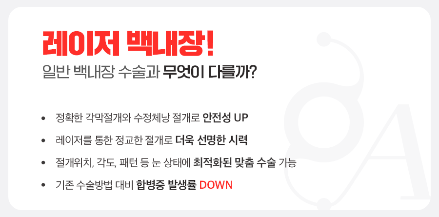 물론 수술에 필요한 첨단 장비가 갖춰 있는지도 꼭 확인해야 할 중요 사항입니다. 무엇보다 안전성이 높은 레이저 백내장 수술이라도 주변 조직의 손상 없이 인공수정체를 삽입해야 하는 정밀한 수술이기 때문에 의료진의 수술 숙련도 역시 중요하다고 말씀드릴 수 있습니다.