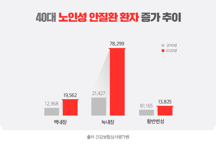건강보험심사평가원에 따르면 지난 10년 새 백내장 등의 노인성 안질환 환자 수가 약 3배 가까이 증가한 것으로 나타났습니다. 노안과 백내장은 시력 저하의 대표적인 원인 중 하나로 인구 고령화와 최근 중장년층의 생활 패턴이 폭넓게 변화함에 따라 노안·백내장 수술을 하는 사람들이 급격히 늘어나는 추세인데요. 사실상 이제는 백내장을 ‘노인 질환’이라고 하는 것 역시 옛말이 되는거죠.