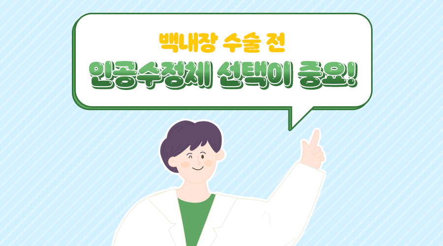 백내장 수술 시간은 10분 내외로 짧은 편인데요. 이 때문에 백내장 수술이 간단한 수술이라고 생각하시는 경우도 있습니다. 하지만 수술 시 삽입되는 인공수정체의 종류가 수술 후 시력의 질에 직접적인 영향을 미칠 수 있기 때문에 무엇보다 수술 전 본인의 눈 상태와 라이프스타일에 맞는 인공수정체를 선택하는 것이 중요하다고 말씀드릴 수 있습니다.