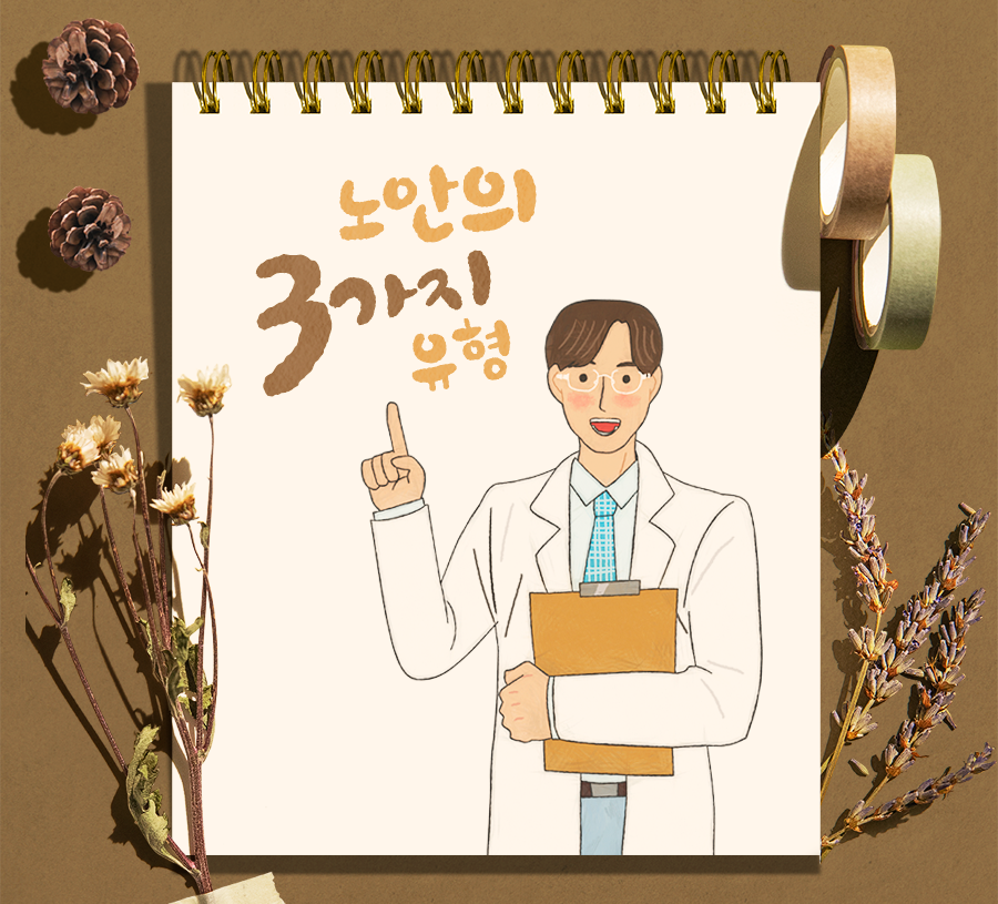 그러나 여기서 강조하고 싶은 것은 노안이 발생했다고 해서 모두 같은 유형이라고 할 수 없다는 점인데요. 굴절력에 따라 임상적 양상에서 차이를 보이는데 보통 정시성 노안, 근시성 노안, 원시성 노안으로 구분되는 것이 일반적입니다.