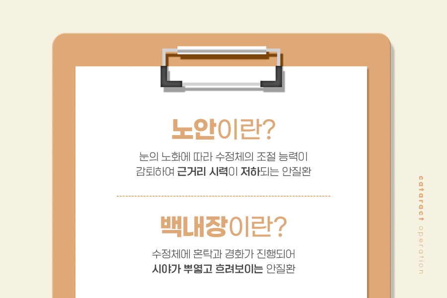 노안은 눈의 노화에 따라 수정체의 조절 능력이 감퇴하면서 근거리 시력이 저하되어 시력에 불편함을 느끼는 현상으로, 가까운 거리를 볼 때 초점이 잘 안 맞는 증상이 나타납니다. 그러나 백내장은 거리에 상관없이 수정체에 혼탁과 경화가 진행이 되면서 시야가 뿌옇고 흐려 보이는 질환으로 빛 번짐, 침침함, 밝은 곳에서도 누렇고 안개가 낀 것처럼 보이는 증상 등이 나타납니다.