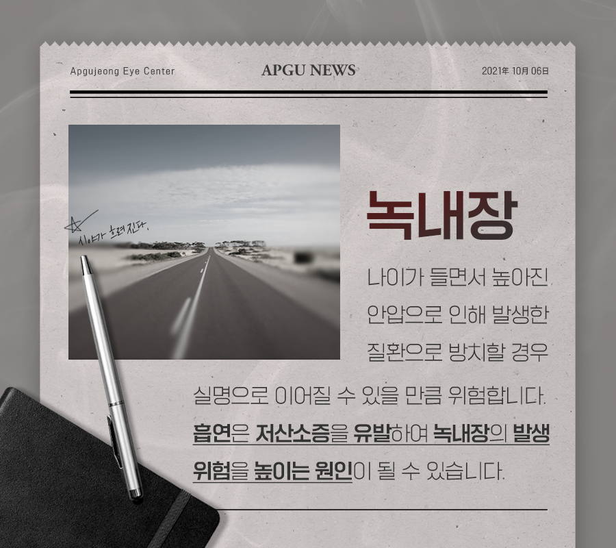 녹내장은 나이가 들면서 안압이 높아져 시신경에 이상이 발생해 시야결손이 나타나는 질환입니다. 안압이 높아지면 물체가 흐릿하게 보이고, 통증이 있는 경우도 있습니다. 이를 방치할 경우 실명을 유발할 수 있을 정도인데요. 그렇기 때문에 평소 안압을 관리하면서 녹내장의 진행을 늦춰야 합니다. 그러나 흡연은 저산소증을 유발하여 시신경에 손상을 주어 녹내장의 발생 위험을 더욱 높이는 원인이 될 수 있는데요. 만약, 녹내장을 진단받으셨다면 흡연은 멀리 하시는 것이 좋습니다.