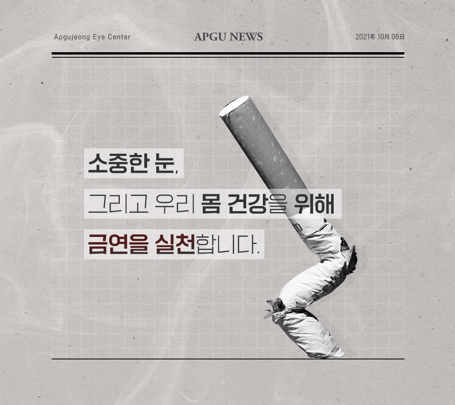 우리의 몸에 좋지 않은 영향을 주는 흡연, 특히 눈에도 문제를 일으키는 원인으로 작용하기 때문에 결국 금연이 최선이라 할 수 있습니다. 주변의 담배 연기에 노출되는 간접 흡연은 안구건조증까지 부추길 수 있으므로 소중한 눈 건강을 위해서라도 금연을 실천해 보시기를 바랍니다.