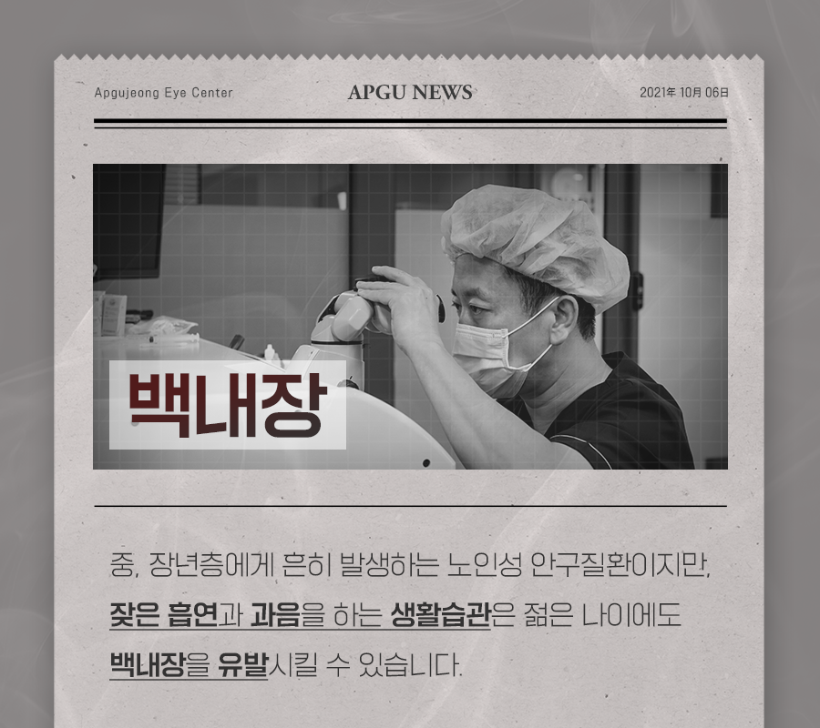 중, 장년층에게 흔히 발생하는 백내장은 대표적인 노인성 안구 질환입니다. 수정체의 혼탁으로 시야가 뿌옇고 흐려보이는 질환으로 노화가 진행되면서 자연스럽게 찾아오기도 하죠. 하지만, 평소 과음이나 잦은 흡연, 과도한 전자기기 사용 등의 생활 습관을 가지고 있는 경우 백내장은 더욱 빠르게 찾아올 수 있습니다.