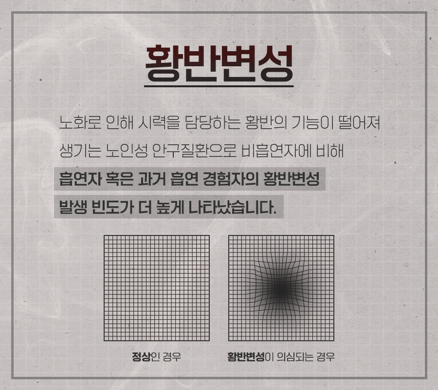 황반변성은 우리 눈에 망막이라고 하는 세포층 중에서 시력에 가장 중요한 부위인 황반의 기능이 떨어져 생기는 안구 질환입니다. 보통 노화에 의해 발생하기 때문에 나이관련황반변성이라고 불리는데요. 해당 질환이 생기면 시야의 중앙이 흐려지다가 검은 점이 생기며, 심해지면 시력을 잃을 수 있어, 3대 실명 질환 중 하나로 꼽히기도 합니다. 약물치료를 통해 증상을 일부 억제할 수 있지만, 완치가 가능한 병은 아니기 때문에 발병 자체를 예방하는 것이 가장 좋은데요. 연구에 따르면 담배를 한 번도 피지 않은 사람에 비해 현재 흡연을 하거나 과거에 피웠던 사람들의 황반변성 발생 빈도가 더 높은 것으로 밝혀지기도 했습니다.