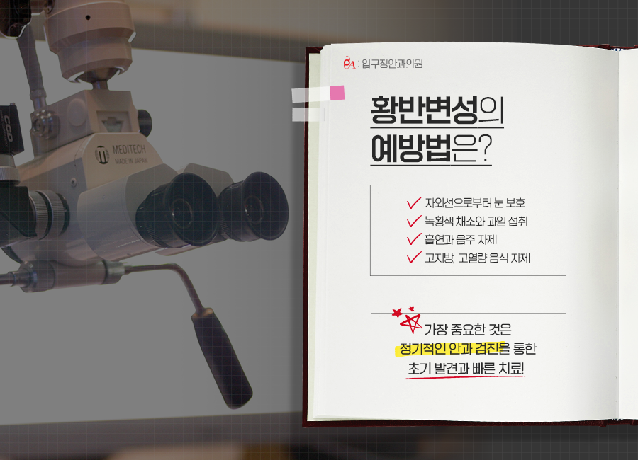 황반변성에 대한 가족력이 있거나 시력 저하, 이상 시각 등 증상이 의심될 경우 빠른 검진을 받아보시는 것을 권유해 드리고 싶습니다. 또한 평소 자외선으로부터 눈을 보호하고, 녹황색 채소와 과일을 많이 섭취하는 것이 좋습니다. 흡연과 음주는 자제하고 고지방, 고열량 음식은 피하시는 것도 권해 드립니다.