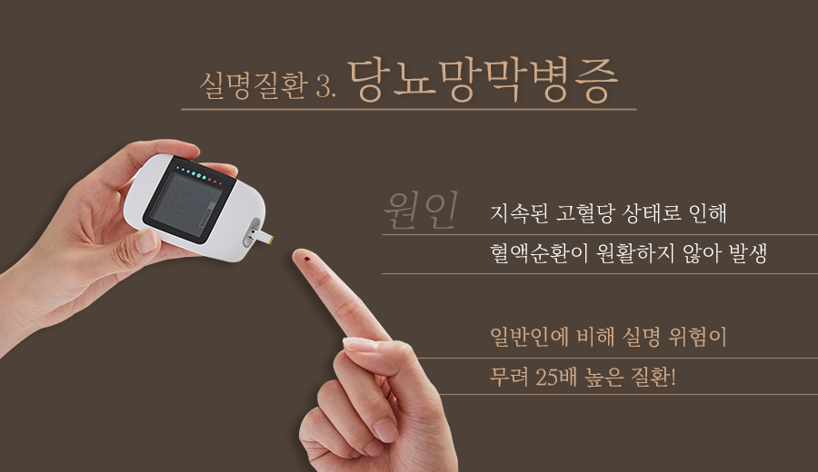 당뇨망막병증은 고혈당 상태가 지속되면서 혈액순환이 원활하지 않아 망막에 발생한 합병증인데요. 당뇨병 환자에게 발견되는 질환으로 일반인에 비해 실명 위험이 무려 25배나 높은 위험한 질환입니다.