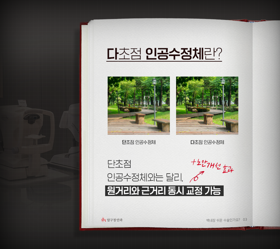 이때 사용되는 다초점 인공수정체는 원거리와 근거리를 함께 교정해 백내장 치료와 함께 노안 개선 효과까지 볼 수 있어 만족도가 높은 수술이기도 합니다.