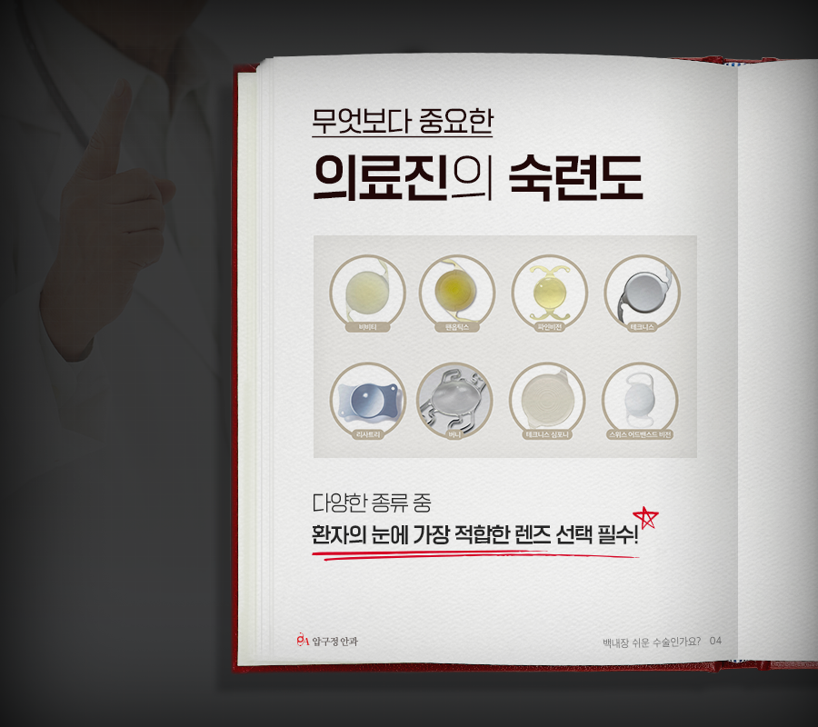 이렇게 만족도가 높은 수술이라고 하더라도 가장 중요한 것은 의료진의 숙련도라고 할 수 있는데요. 모든 눈 수술이 그러하듯 백내장 수술 과정 시에도 주변 조직에 어느정도 손상이 생길 수 있기에 의료진의 정교한 스킬이 중요합니다. 또, 다양한 인공수정체의 종류 중 환자의 눈에 가장 적합한 렌즈를 선택할 수 있을 만큼 풍부한 수술 경험은 필수적입니다.