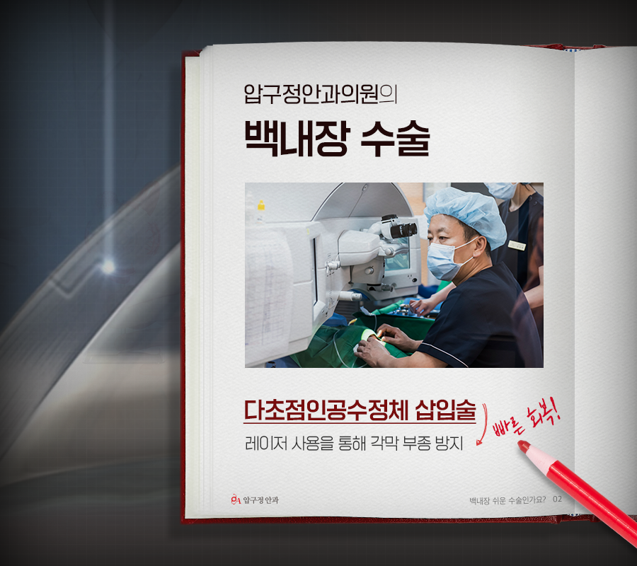 특히 저희 압구정안과의원에서 시행하고 있는 백내장 수술인 다초점 인공수정체삽입술은 나노줄 로우 에너지의 나노 자극을 통해 각막을 절개하기 때문에 각막 부종을 방지할 수 있습니다.