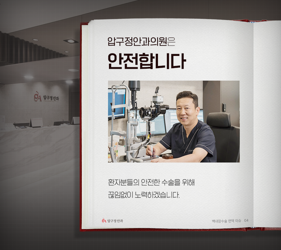 최근 논란으로 인해 백내장 수술의 안전성에 대해 걱정이 많으실텐데요. 저희 압구정안과의원에서 안전한 수술을 위해 끊임없이 노력하고 있으니, 안심하고 백내장 수술 받으시길 바랍니다!
