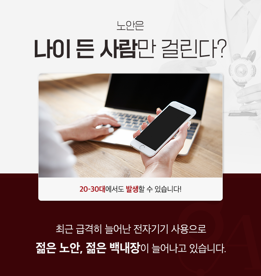일반적으로는 노화가 시작되는 40대부터 발생하는 것이 맞지만, 최근에는 전자기기 사용량이 급증함에 따라 20-30대의 젊은 노안이 나타나고 있습니다.