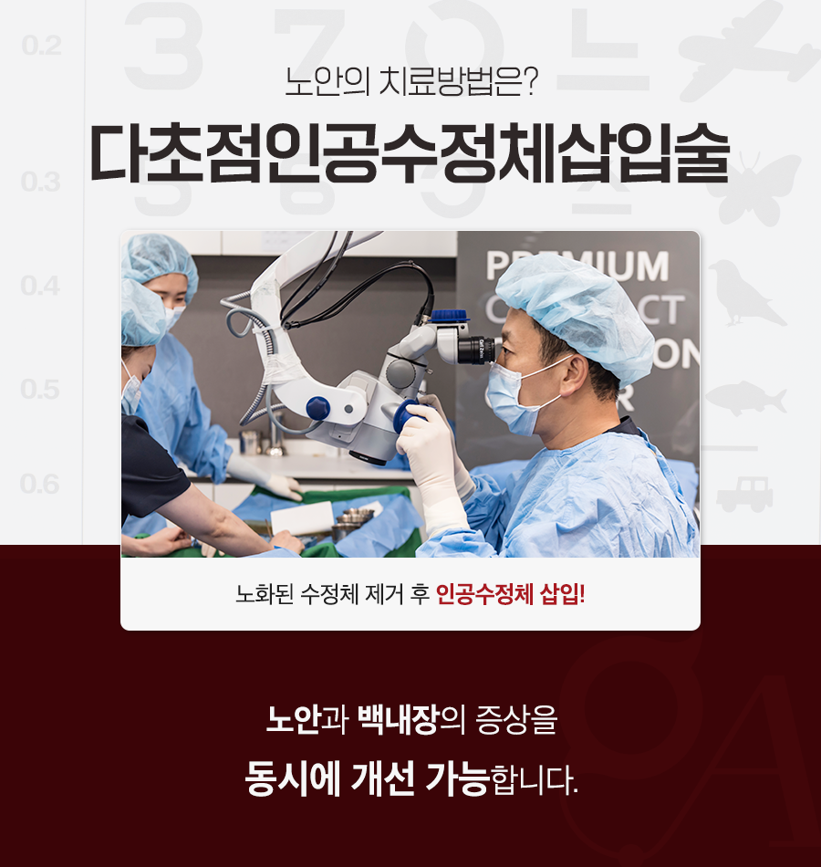 그렇다면 만일 노안과 백내장이 모두 있는 경우, 치료할 수 있는 방법은 무엇일까요? 바로 인공수정체를 안내에 삽입하는 다초점인공수정체 삽입술을 통해 가능한데요. 노화된 본래의 수정체를 제거한 자리에 인공수정체를 삽입하는 방법으로 노안과 백내장의 증상을 동시에 개선할 수 있습니다.