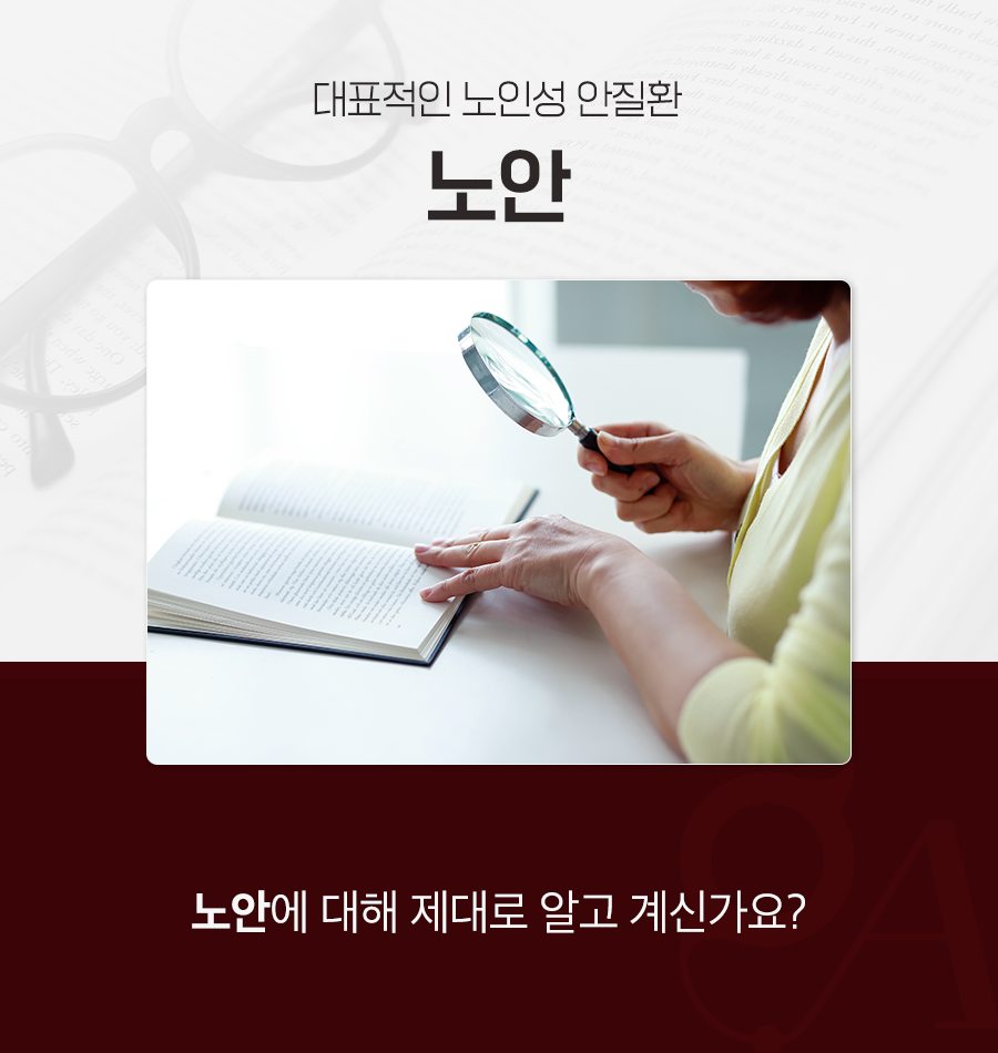 우리 몸에서 8할을 차지할 정도로 중요한 역할을 하고 있는 눈은 나이가 들면서 노화로 인해 적신호가 켜지는 경우가 많습니다. 대표적인 노화 증상으로는 노안과 백내장이 있는데요. 그 중에서도 노안은 나이가 들어감에 따라 수정체가 딱딱해지면서 근거리 초점 조절이 어려워지는 노인성 안질환입니다.