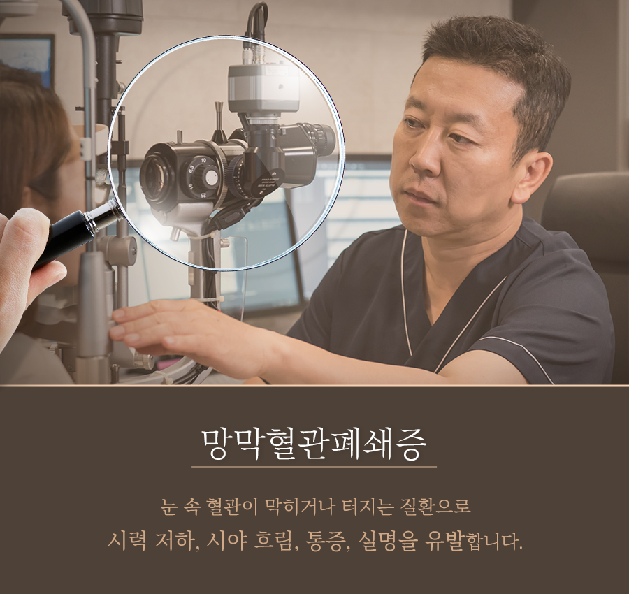 망막혈관폐쇄증은 흔히 ‘눈 중풍’이라고도 불리는 질환인데요. 뇌에 있는 혈관이 막히거나 터지면 생기는 중풍이라는 이름처럼 눈 속 혈관이 막히거나 터지는 질환을 말합니다. 이 질환이 발생되면 시력 저하, 시야 흐림 등과 같은 시야 장애 증상이 찾아올 수 있고 망막 동맥의 중심부가 폐쇄될 경우 곧바로 치료하지 않으면 통증은 물론, 실명으로 이어질 수 있는 위험한 질환 중 하나입니다.