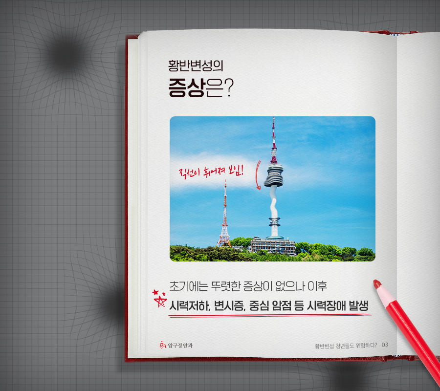 이외에도 책을 읽으실 때 일부가 지워진 것처럼 보이거나 직선이 구불거리며 휘어져 보이는 등의 증상들이 나타날 수 있으니 참고하세요.