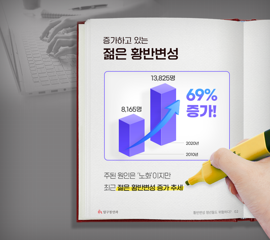 하지만 최근에는 조금 더 이른 나이인 40대에서도 해당 안질환이 계속해서 증가하는 추세인데요. 실제 건강보험심사평가원 집계에 따르면 황반변성으로 진료를 받은 40대 환자는 2020년 1만 3,825명으로 2010년 8,165명에 비하여 69% 정도 증가할 정도로 젊은 연령층에서도 해당 안질환이 발병하고 있음을 알 수 있습니다.