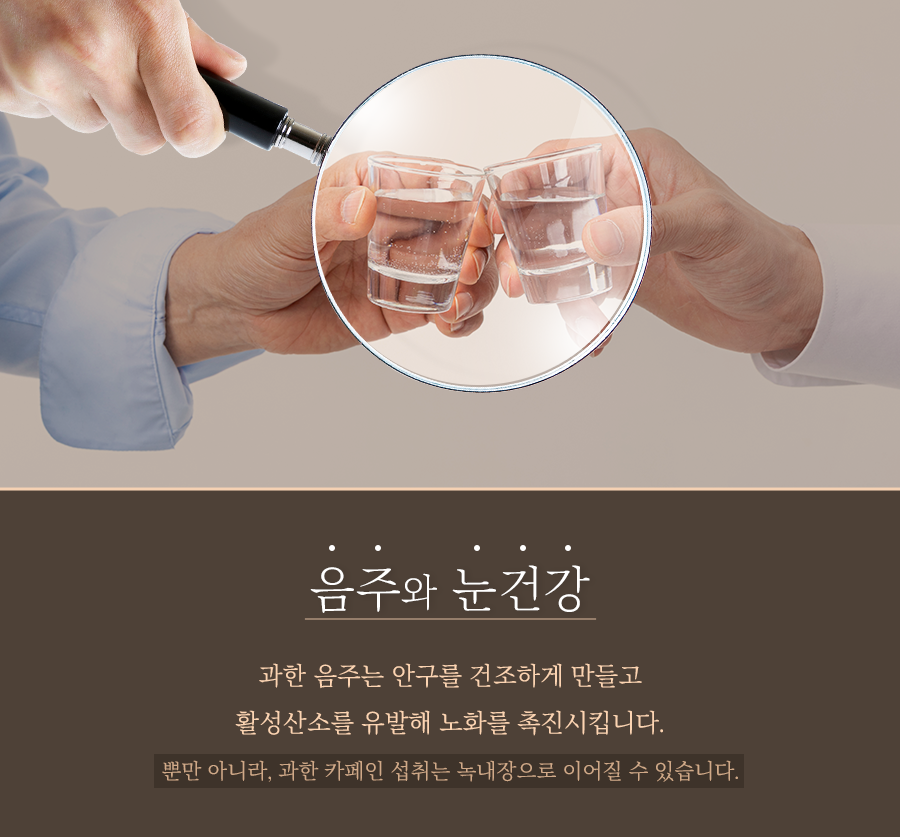 과한 음주는 체내의 수분을 감소시켜 안구를 건조하게 만듭니다. 이는 눈 안의 활성산소를 유발시켜 노화로 이어지게 되는데요. 뿐만 아니라 술에 포함된 아세트알데히드 성분이 혈액을 타고 전신으로 퍼지면서 혈관을 확장시키고 눈의 충혈을 유발하기도 합니다.