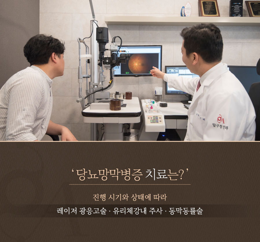 그렇다면 당뇨망막증 치료는 어떻게 해야 할까요? 당뇨망막병증 치료는 진행 시기나 상태에 따라 달라지는데요. 시술로는 크게 레이저 광응고술, 유리체강내 주사, 공막동률술이 있습니다.