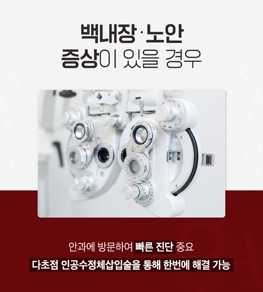 노안과 백내장의 증상이 비슷하다 보니 이를 방치하다 치료 시기를 놓쳐 백내장 중기 이후 백내장 진단을 받는 분들도 많아지고 있습니다.
