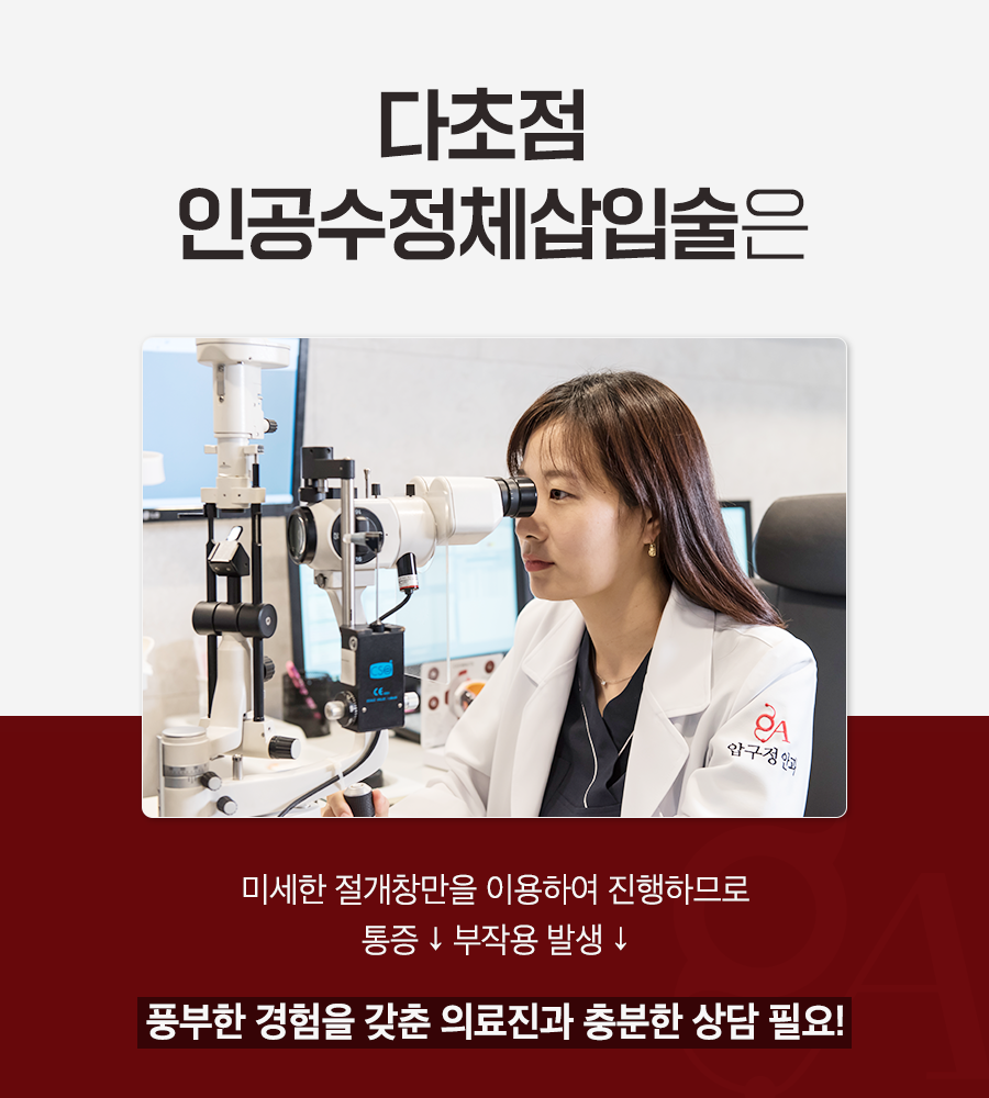 다초점 인공수정체삽입술은 혼탁해진 수정체를 제거하고 새로운 인공수정체를 넣는 수술인데요. 다초점 인공수정체를 넣을 미세한 절개창만 내어 진행하므로 통증이 적고 수술 후 부작용이 적다는 장점이 있습니다.