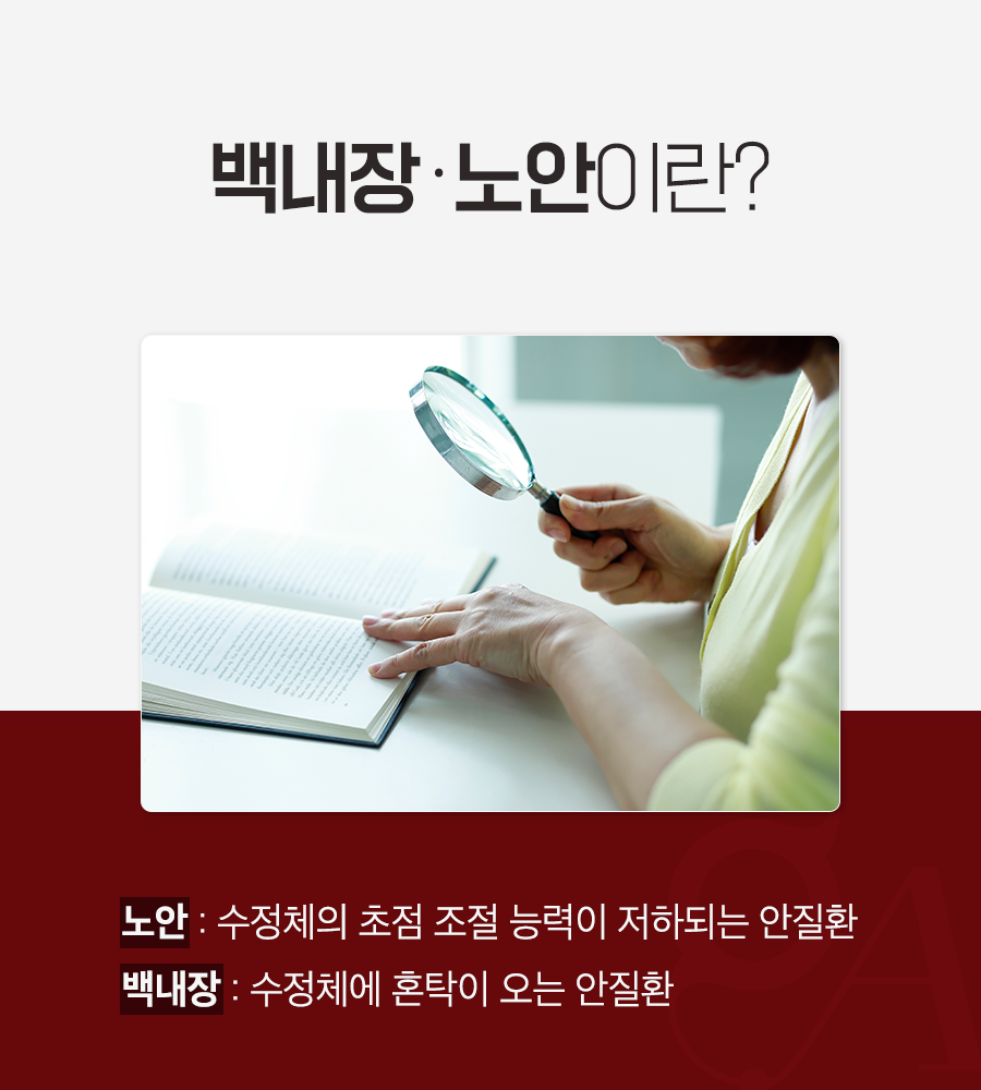 먼저 노안은 노화로 인해 수정체의 조절 능력이 저하되어 근거리 시력 저하가 나타나는 질환인데요. 이로 인해 사물을 멀리 놓고 봐야 사물이 또렷하게 보이며, 초점 전환이 늦어져 멀리 있는 곳을 보다가 가까운 곳을 보려고 할 때 일시적으로 흐릿하게 보이게 됩니다.