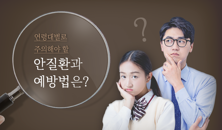 오늘은 연령대별로 조심해야 하는 안질환에는 어떤 것들이 있는지, 눈 질환별 예방법에는 어떤 것들이 있는지에 대해 알아보는 시간을 갖도록 하겠습니다.