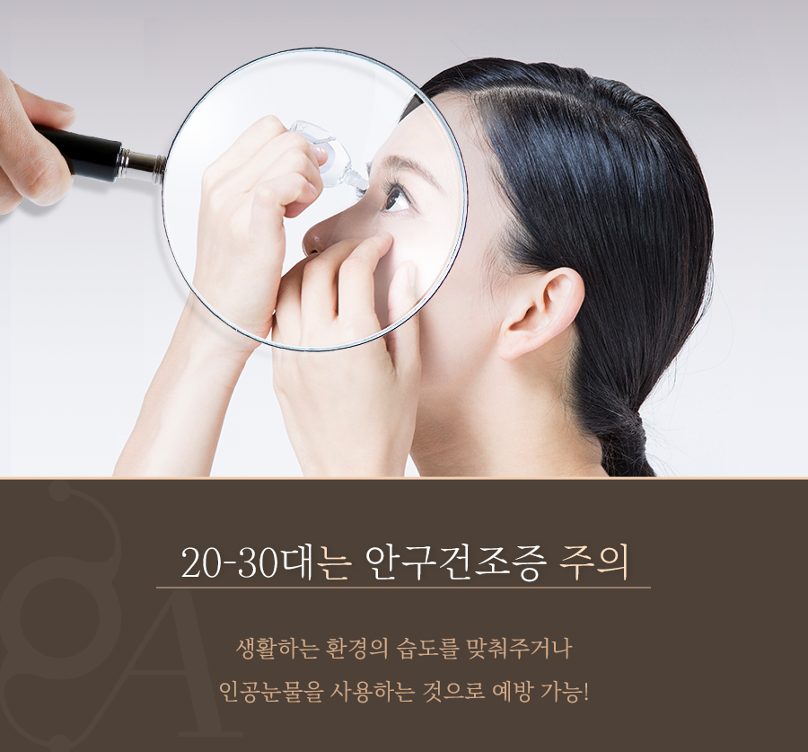 20대와 30대 사이에서 쉽게 발생할 수 있는 대표 안질환은 안구건조증입니다. 하루 중 대부분의 시간을 컴퓨터 모니터 혹은 핸드폰 화면을 보면서 사용하게 되는데, 이렇게 한 곳을 장시간 보는 행동은 눈을 깜빡이는 횟수를 줄여 눈을 쉽게 건조하게 만듭니다.