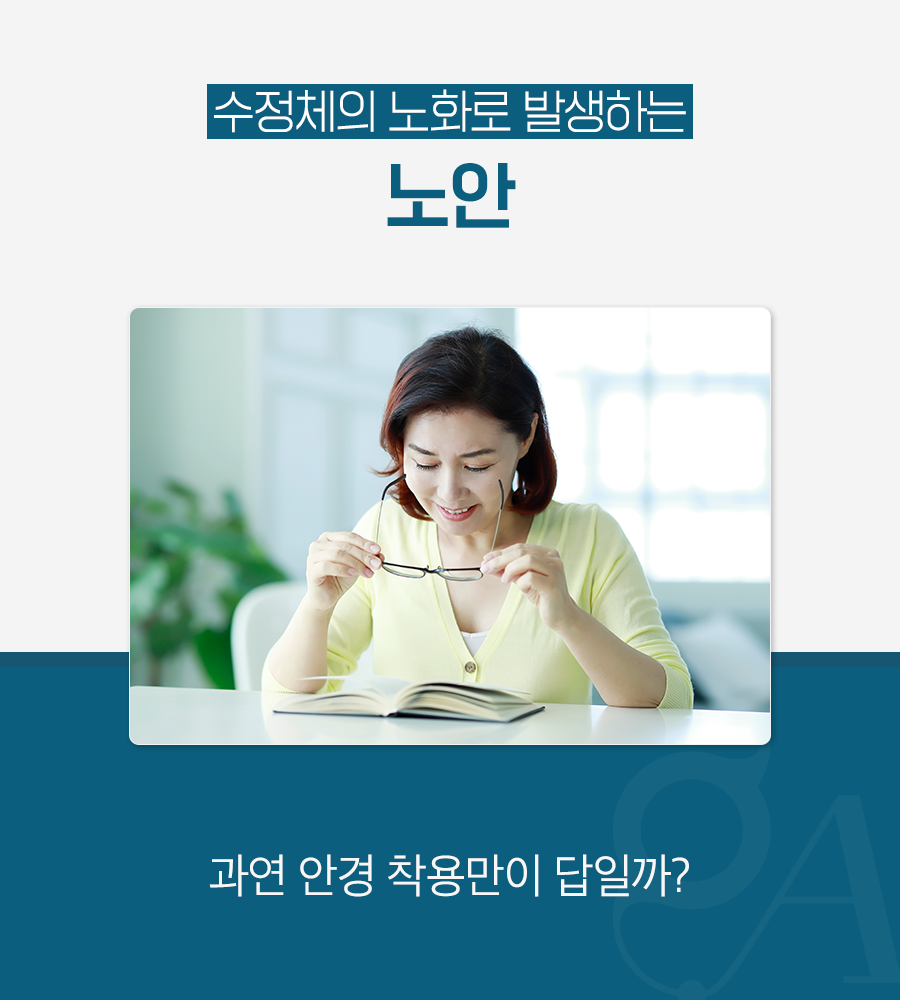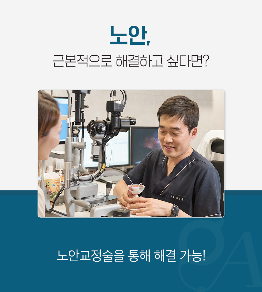 노안으로 인해 저하된 시력을 개선하기 위해 안경이나 돋보기 등을 착용하는 것이 일반적이기는 하지만 부가적인 장치를 착용해야 한다는 점에서 불편함을 유발하는 것은 물론, 노안이 심한 경우에는 시력 저하 외에도 시야가 잘 보이지 않는 증상이 나타나기 때문에 안경 착용 만으로는 시력 개선의 만족도를 얻기 어렵습니다.