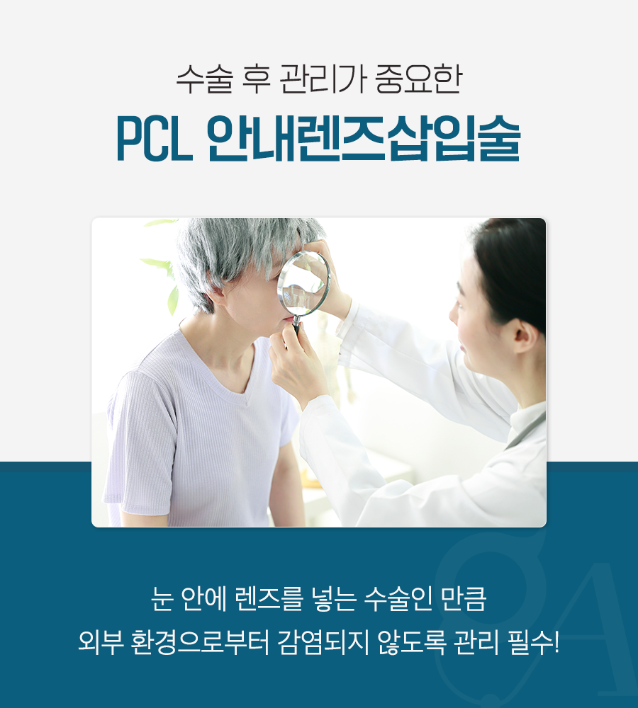 PCL 안내렌즈삽입술은 눈 안에 인공 렌즈를 넣어 진행되는 수술인 만큼 수술 후 관리하는 것도 매우 중요한데요. 특히 외부 환경으로 인해 감염되지 않도록 신경 써줘야 합니다.