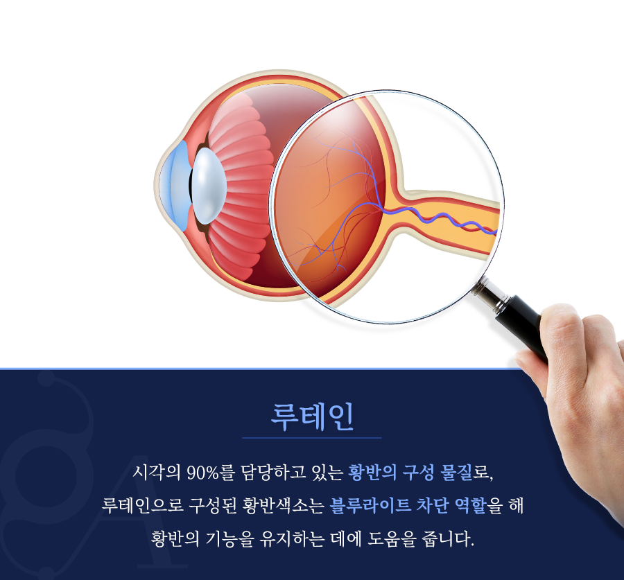 대표적인 눈 건강 영양제 성분이라고 한다면 ‘루테인’을 들 수 있죠. 루테인은 시각의 90%를 담당하고 있는 황반의 구성 물질입니다. 루테인으로 구성된 황반색소는 블루라이트를 차단하는 역할을 하며 황반의 기능을 유지하는 데에 도움을 주죠. 다만 2-30대부터 이 황반색소의 밀도가 줄어들기 시작하며, 5-60대가 되면 50% 이상 저하됩니다.
