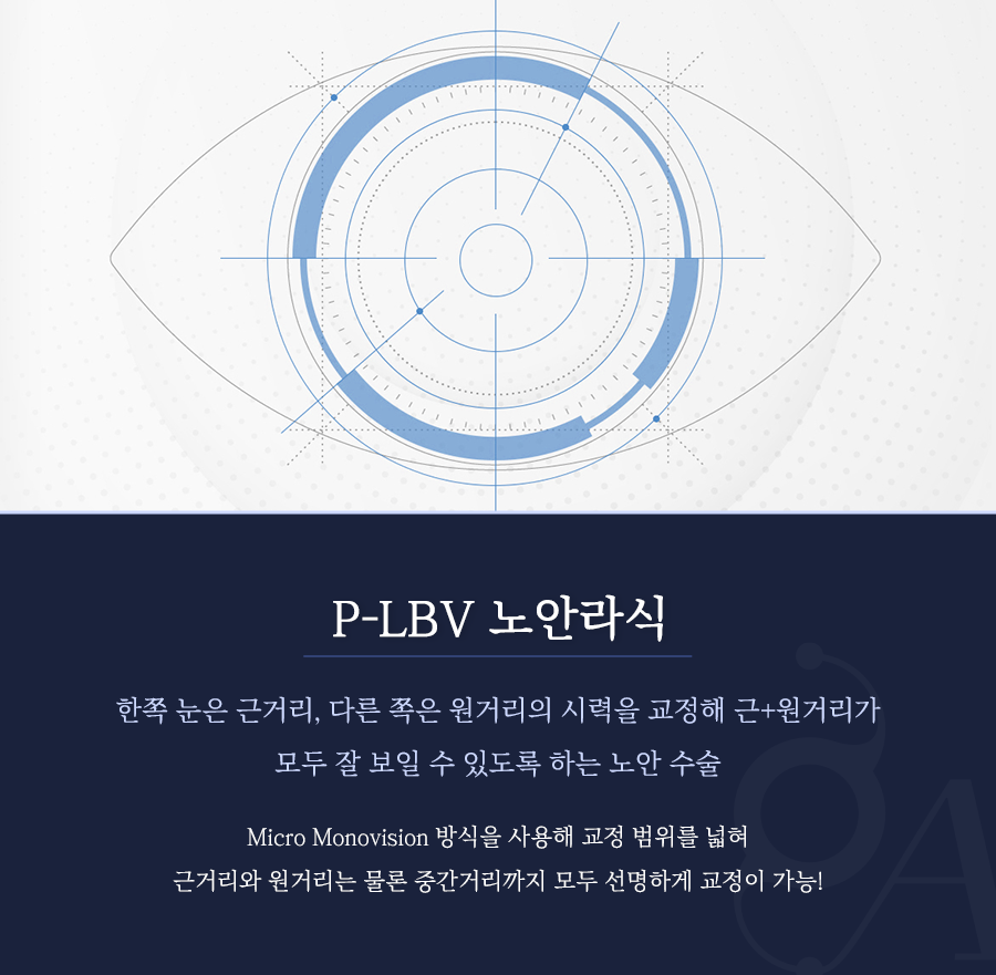 P-LBV 노안라식의 경우 기존 방법에서 업그레이드된 노안라식으로 교정 범위가 넓어 가까운 거리와 먼 거리는 물론 중간거리까지 모두 선명하게 볼 수 있다는 것이 큰 장점이죠.