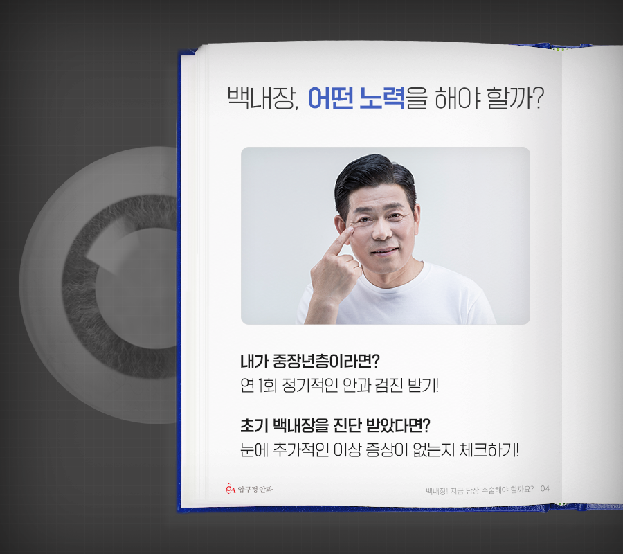 백내장 진단을 받지 않은 경우라고 해도, 내가 중장년층이라면 1년에 한 번씩은 정기적으로 안과 검진을 받아 백내장 수술의 골든타임을 놓치지 않으셔야 합니다.