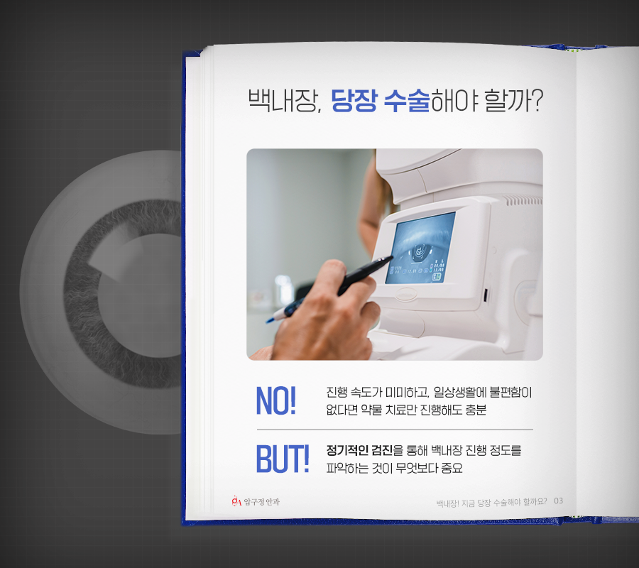 하지만 정기적인 안과 검진을 통해 백내장의 진행 정도를 파악하는 것이 무엇보다 중요하며, 필요 시에는 수술을 진행해야 합니다. 이 때 끝까지 수술을 받지 않고 백내장 말기에까지 이르게 된다면 수술이 매우 복잡해질 수 있고, 안압 상승으로 인한 질환들이 발생할 수 있으니 의료진과의 충분한 상담 후 수술 시기를 결정하시는 것이 좋습니다.