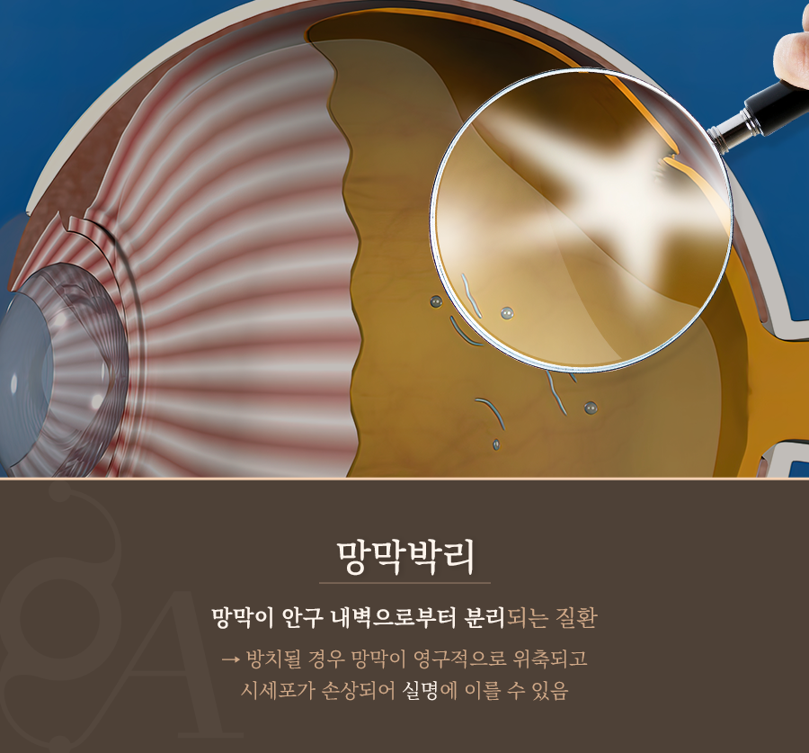 이러한 망막에 발생하는 대표적인 안구 질환이 바로 망막박리입니다. 이는 망막이 안구의 내벽으로부터 분리되는 질환인데요. 만약 망막이 박리된 상태가 길어지면 망막이 영구적으로 위축되고, 시세포가 손상되기 때문에 심할 경우 실명까지도 이어질 수 있어 치료의 골든타임을 놓치지 않는 것이 무엇보다 중요하죠.