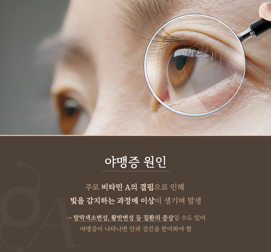 야맹증은 주로 비타민 A 부족으로 인해 발생하는 증상입니다. 우리 눈에서 빛을 감지하여 뇌로 시각정보를 전달하는 부분은 바로 망막인데요. 비타민 A가 부족해지면 망막에서 빛을 감지하는 과정인 ‘로돕신의 재합성’이 어려워져 야맹증이 나타나게 되는 것입니다.