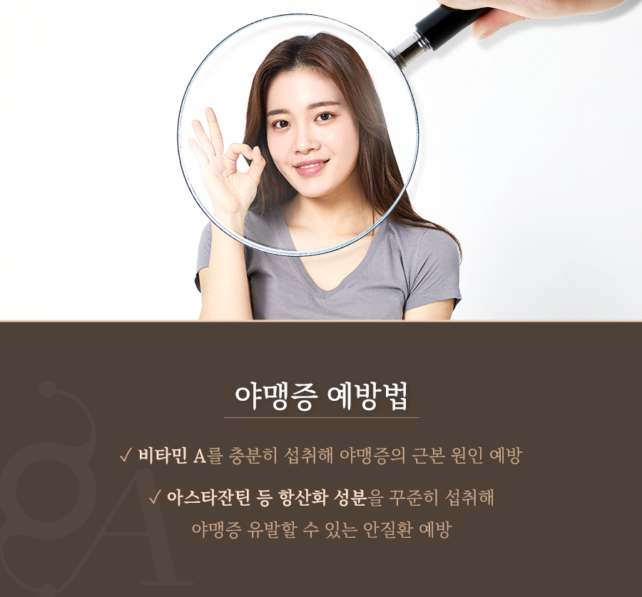 특히 야맹증은 망막색소변성, 황반변성 등의 안질환에 의해서도 발생할 수 있는데요. 이러한 안질환들을 방치하게 되면 실명에까지 이를 수 있기 때문에 야맹증이 나타나기 시작했다면 조속히 가까운 안과를 찾아 정밀검진을 받아 보시는 것이 현명합니다.