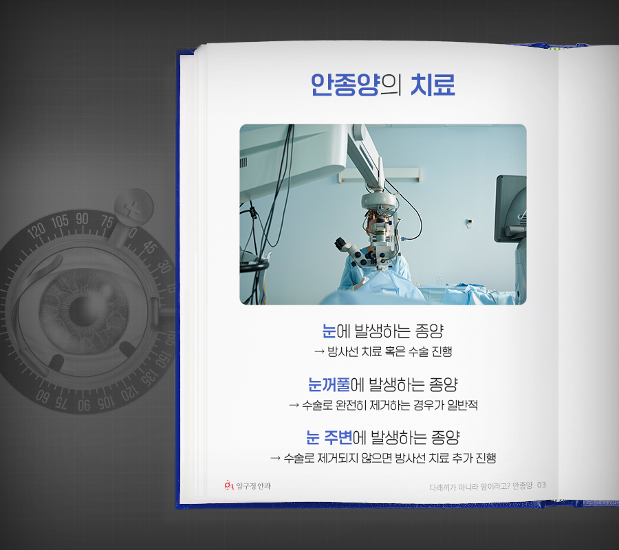 - 눈꺼풀에 발생한 종양의 경우 : 수술로 완전히 제거하는 것이 일반적이며, 경우에 따라 방사선 치료, 항암화학요법 등을 사용하게 됩니다.