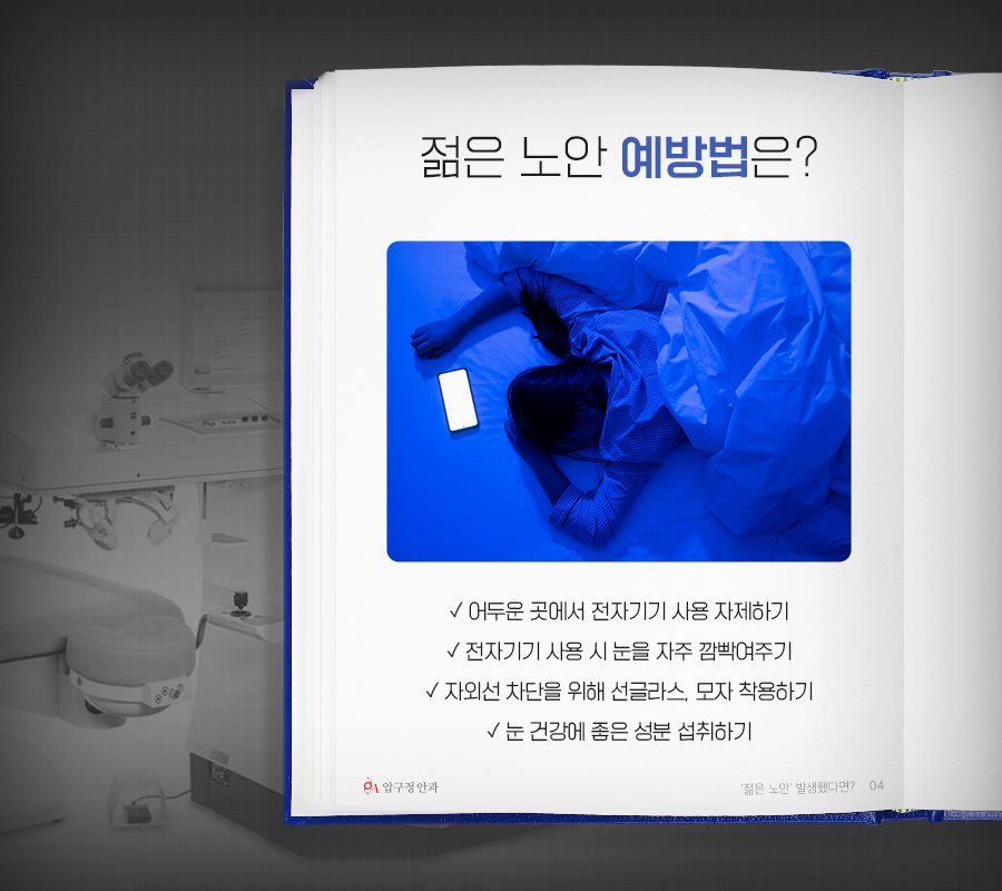 보통 노안이라 하면 나이를 먹으면서 자연스럽게 발생하는 눈의 노화현상으로 생각하는 경우가 많은데요. 위와 같은 이유들로 인해 눈의 노화가 점점 빨라지면서 ‘젊은 노안’도 많이 발생하고 있죠.