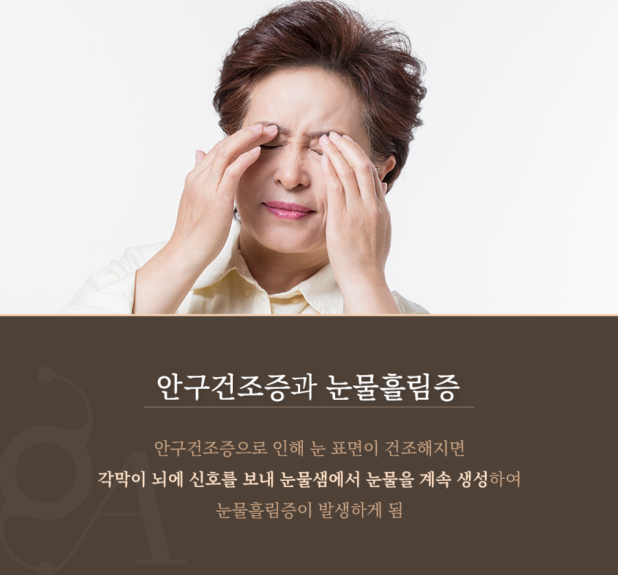 눈물이 흐르는 것과는 전혀 상관없을 것 같은 안구건조증이 어떻게 눈물흘림증의 원인이 될까 하는 의문이 드실 수도 있는데요. 안구건조증이 발생해 눈 표면이 건조해지면 각막이 뇌에 신호를 보내 눈물샘에서 계속 눈물을 생성하기 때문에 눈물흘림증이 발생하게 됩니다. 실제로 눈물흘림증 환자 중 안구건조증으로 인해 증상이 발생한 비중이 크기도 하죠.