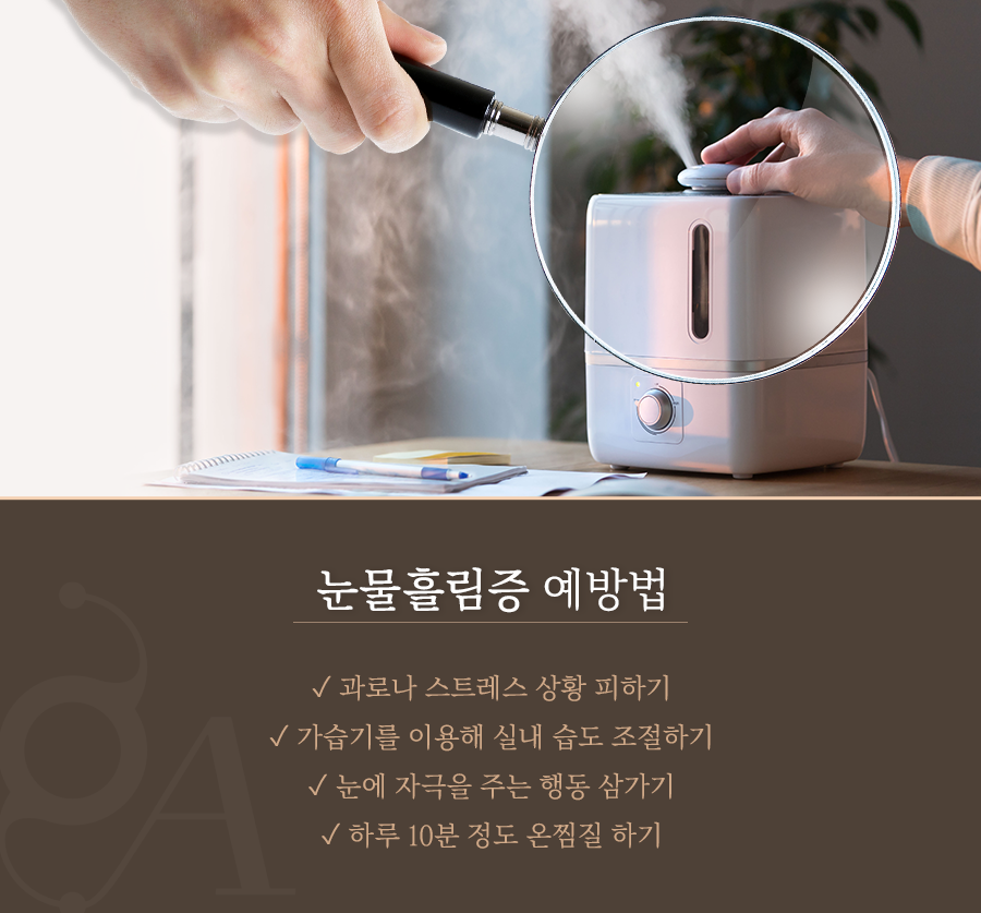 우선, 신체적으로 피로한 경우에 눈물의 분비가 저하될 수 있기 때문에 과로나 스트레스 상황은 가급적 피하는 것이 좋은데요. 또한 에어컨 바람 등으로 실내가 너무 건조해지지 않도록 가습기를 이용해 습도를 조절해야 합니다. 더불어 콘택트렌즈 착용이나 눈 비비기, 오랜 시간 전자기기 사용 등 눈에 직접적인 자극을 줄 수 있는 행동은 삼가며, 하루 10분 정도 온찜질을 해주는 것도 도움됩니다.