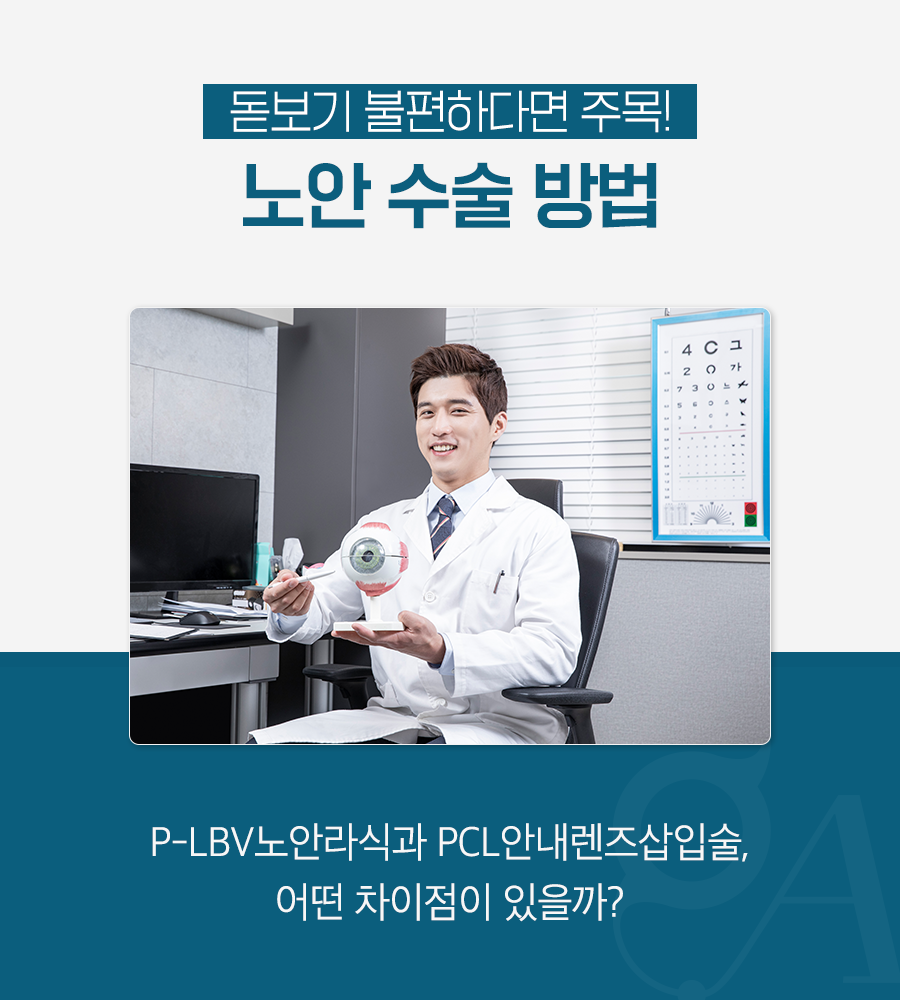 P-LBV노안라식과 PCL안내렌즈삽입술 모두 체계적인 정밀검사 후 의료진의 진단을 바탕으로 진행되는 수술인데요. 이 때 환자의 정확한 눈상태를 분석하고 최적의 절삭량 및 렌즈 종류 등을 결정해야만 만족스러운 결과를 기대할 수 있습니다. 그렇기 때문에 노안교정 수술을 고민하고 계시는 분들은 반드시 풍부한 임상경험을 갖춘 의료진을 찾아가시는 것이 바람직하겠습니다.