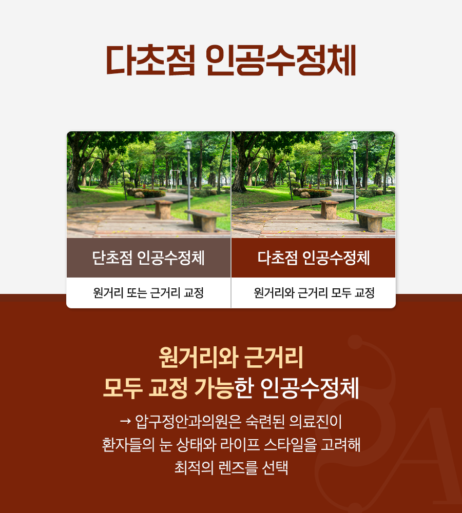 백내장이 발병했던 수정체를 제거한 후에는 다초점 인공수정체를 삽입하게 됩니다. 과거에는 근거리 혹은 원거리 중 하나의 초점에 집중한 단초점렌즈를 주로 사용했는데요. 최근에는 원거리와 근거리를 모두 교정할 수 있는 다초점 인공수정체를 주로 사용하고 있습니다.