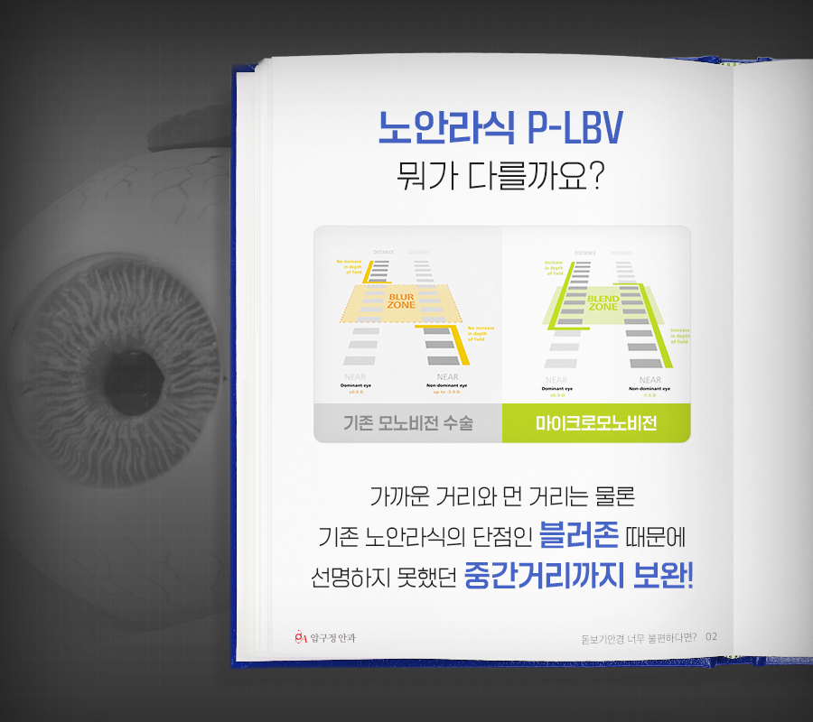 압구정안과에서 진행되는 P-LBV노안라식은 교정 범위를 넓혀 가까운 거리와 먼 거리는 물론 블러존을 보완하여 중간 거리까지 모두 선명하게 볼 수 있는 수술입니다.