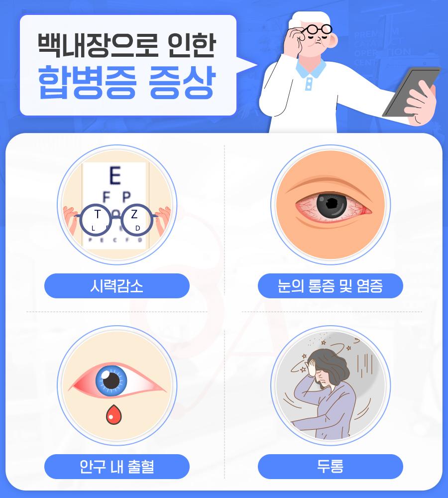 특히 백내장의 경우 방치해둘수록 안압이 상승하면서 안통, 두통 출혈 등의 증상과 더불어 녹내장과 같은 합병증을 유발하는 사례도 있기 때문에 미리 전문 의료기관을 찾아 종합 검진을 받아보는 것이 좋습니다.
