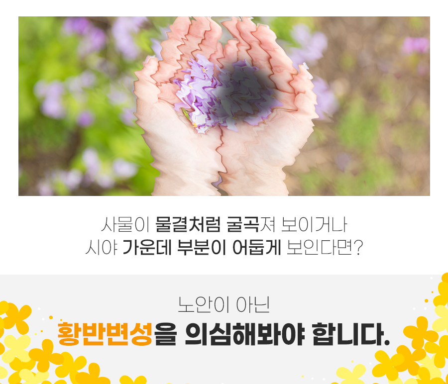 우리의 눈은 신체 변화 중에서 노안이 가장 빠르게 찾아오는데요. 노안은 먼 거리와 가까운 거리를 보기 힘들도록 눈에서 초점을 잘 조절하지 못하는 대표적인 안구질환 중 하나입니다. 하지만 사물이 물결처럼 지그재그로 굴곡져서 보이거나 시야 가운데 부분이 어둡게 잘 보이지 않는다면 황반변성일 확률이 높습니다.