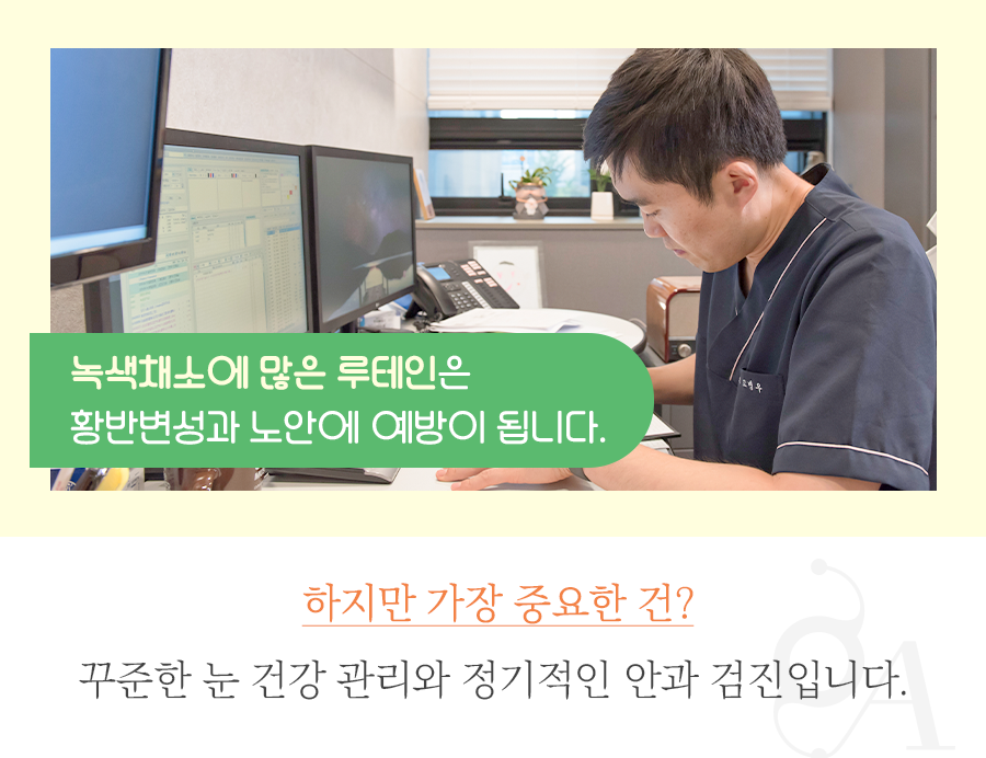 안구질환을 예방하기 위해 평소 눈에 좋은 음식을 섭취하는 분들도 있는데요. 녹색채소에 많이 들어있는 루테인이라는 성분이 눈에 좋다고 알려져 있습니다. 이 루테인은 황반 구성에 도움이 되고 이미 황반변성이 진행되고 있는 것을 억제하는데 도움이 될 수 있습니다. 하지만 음식 섭취만으로는 황반변성의 치료를 기대할 수 없어요. 무엇보다 중요한 건 꾸준한 눈 건강 관리와 정기적인 안과 검진입니다. 이번 기회에 압구정안과의원과 함께 눈 검진받아 보시는 거 어떠세요?