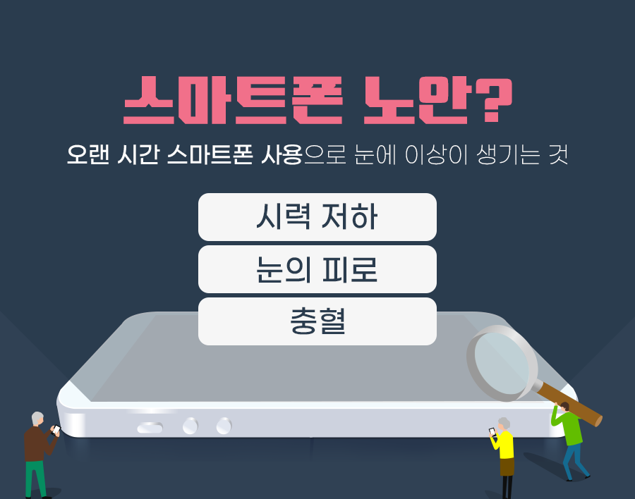스마트폰 노안은 스마트폰으로 인해 노안 증세가 나타나는 걸 말하는데요. 오랫동안 가까운 곳에만 집중하다 보니 먼 곳은 초점을 맞추기 어려워지고 밝은 화면을 집중해서 보다 보니 눈에 피로도 금방 쌓이게 되죠. 게다가 전자기기는 안구건조증을 유발해 우리의 눈을 빨갛게 충혈되게 합니다.