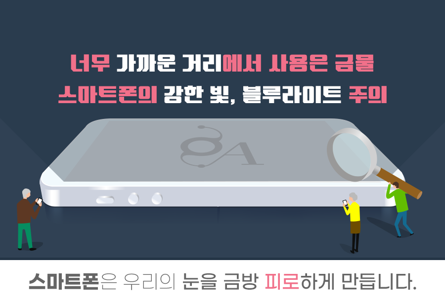 스마트폰을 사용할 때에는 너무 밝지 않도록 그리고 너무 가깝지 않도록 해주세요. 너무 작은 화면을 가까이에 보지 않도록 글자 크기는 크게 하는 것도 좋습니다. 무엇보다 중요한 건 오랜 시간 스마트폰만 바라보지 않도록 휴식을 취해주세요. 10분에 한번씩 먼 곳을 바라보거나 1분 동안 잠시 눈을 감고 눈에 긴장을 풀어주세요.