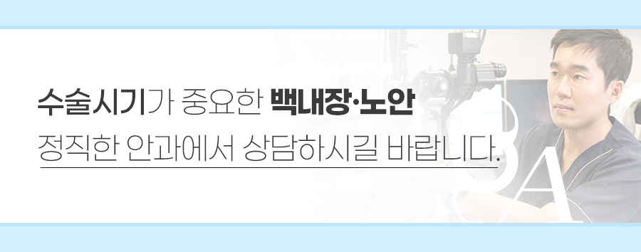 그렇다고 무조건 수술시기를 미루게 되면 질환이 악화되어 상태가 더 나빠질 수 있습니다. 백내장과 노안은 수술시기를 결정하는 것이 최고의 수술결과를 볼 수 있어요. 반드시 과잉진료하지 않는 정직한 안과에서 꾸준한 정기검진을 통해 상담해보시기 바랍니다.